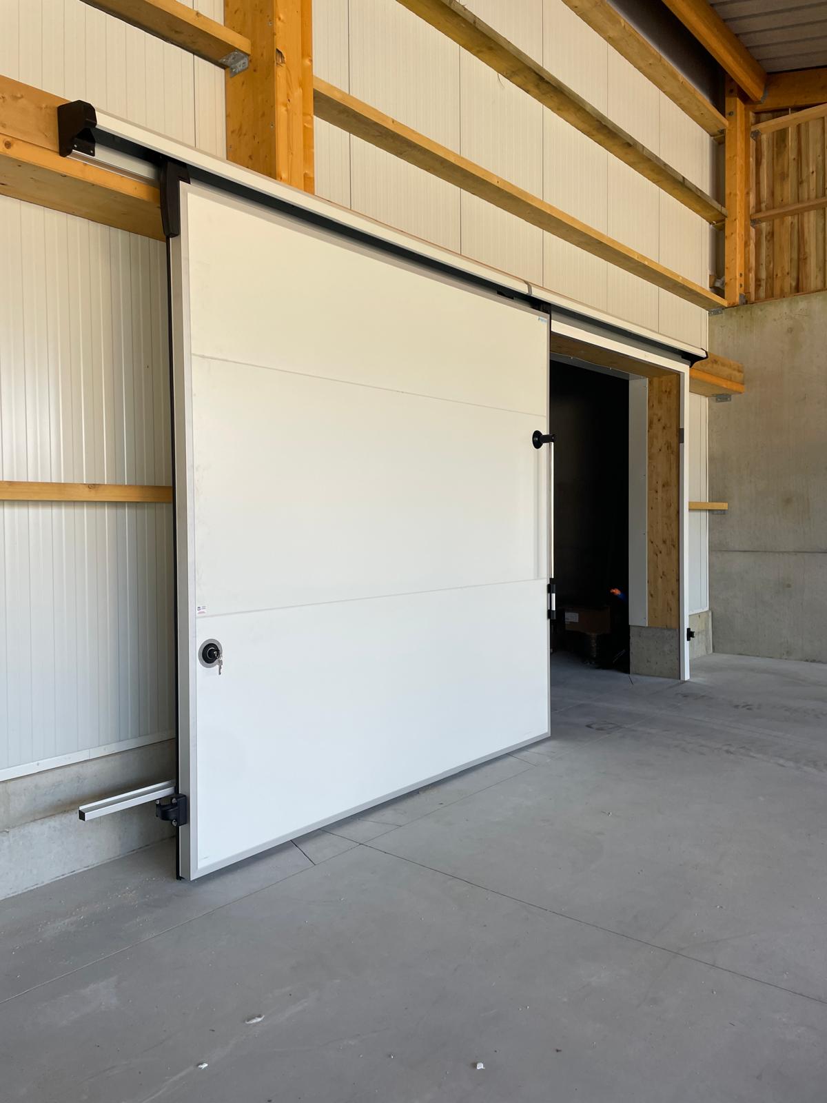 Charpente en lamellé collé, couverture en panneaux sandwichs acier 150mm, bardage, Portes isotherme, et installation de 4 chambres froides.