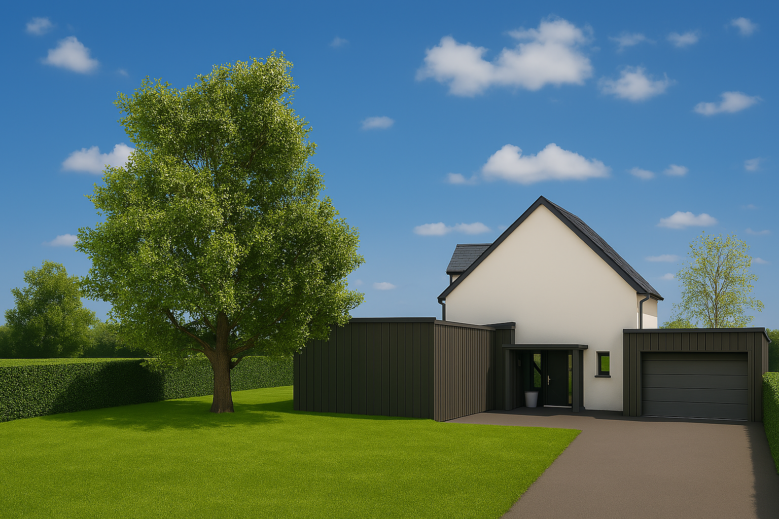 Les façades principales seront traitées par un enduit de ravalement et les 2 éléments en toit terrasse seront recouverts d’un zinc à joints debout.