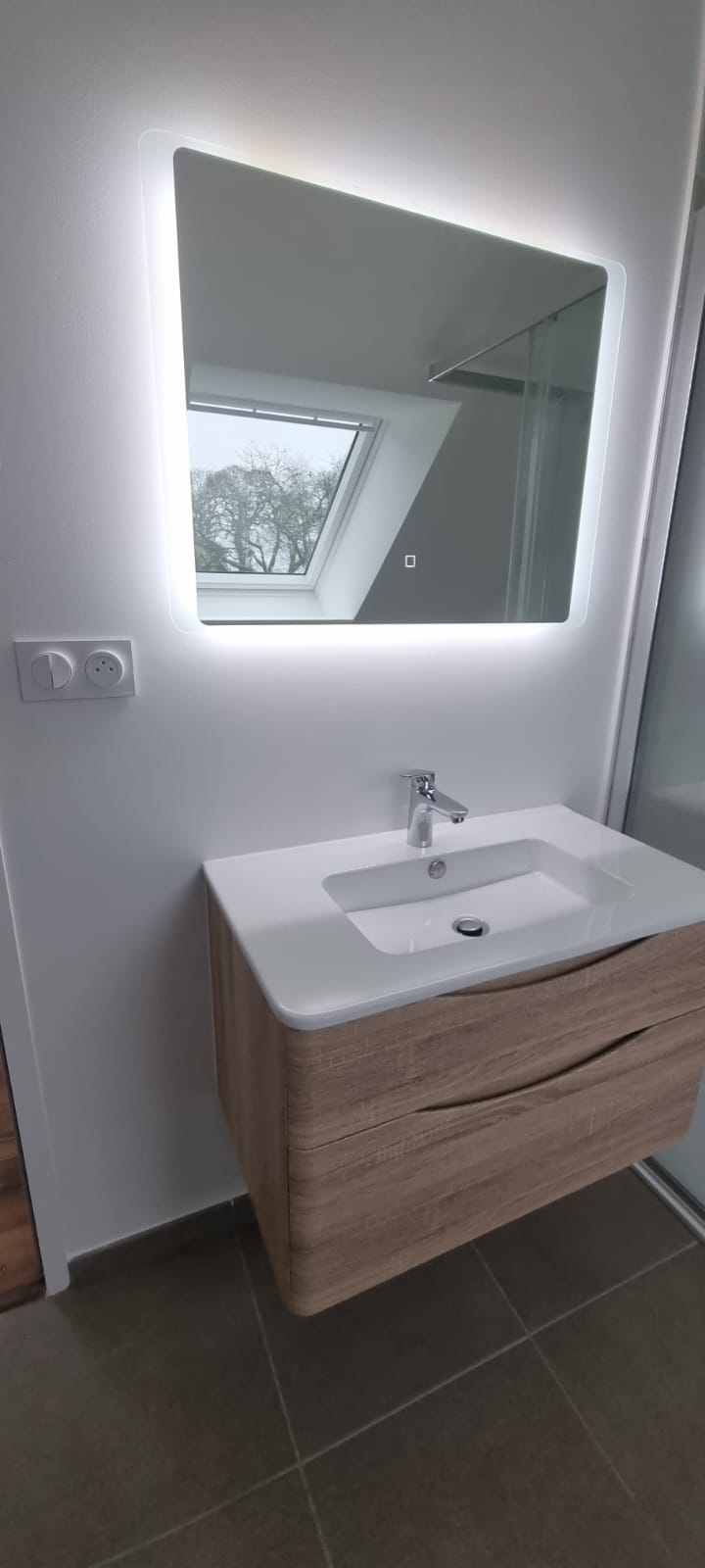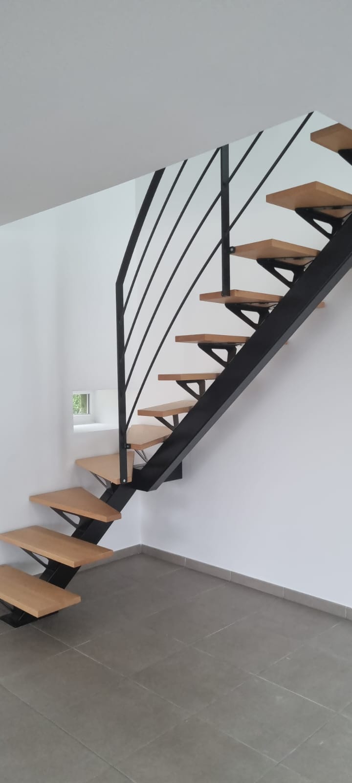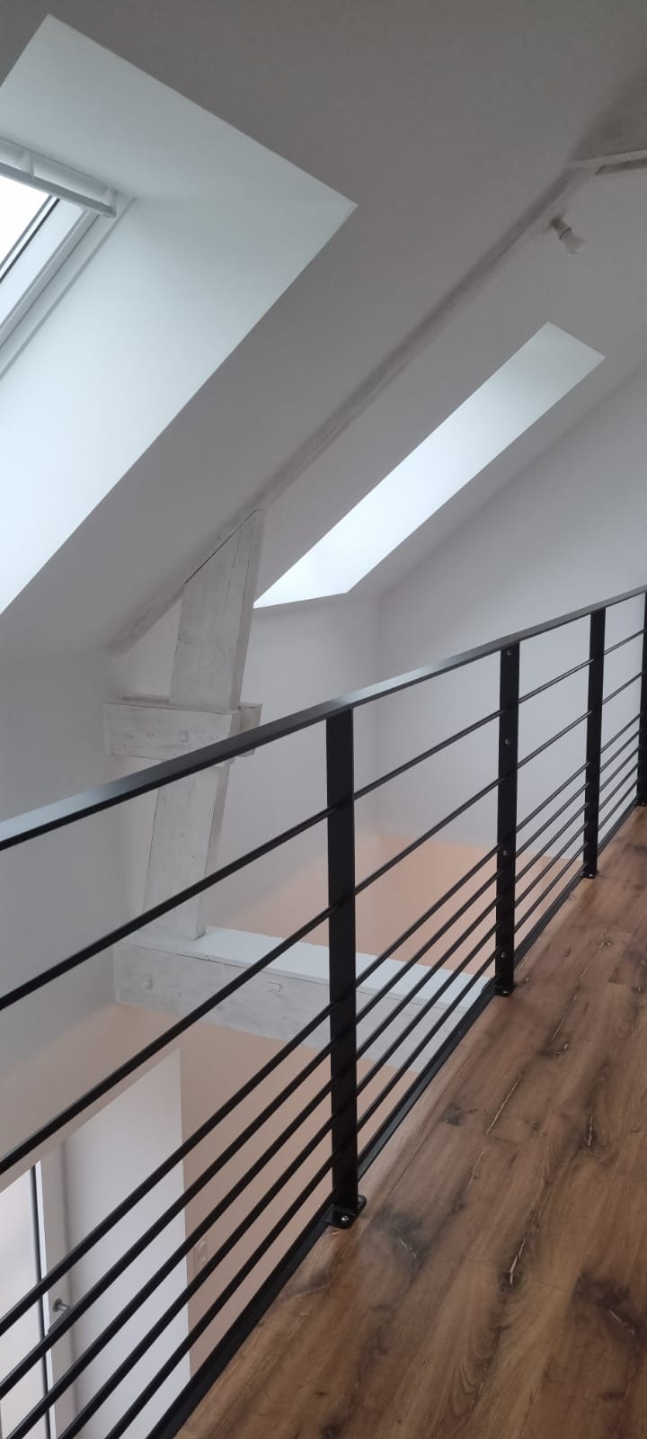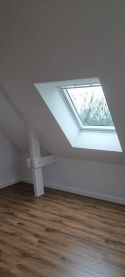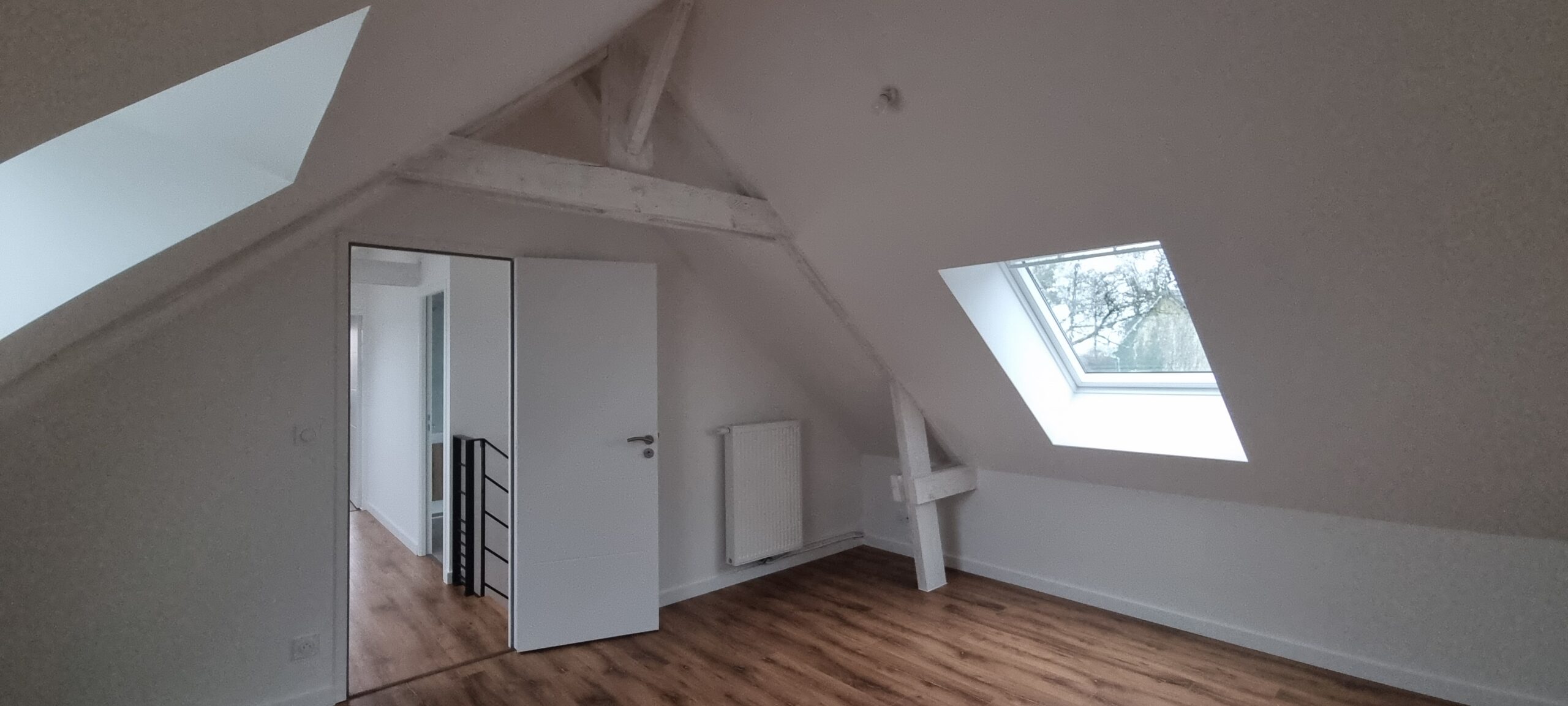 À l’étage, 2 grandes chambres et une salle d’eau. Un vide sur séjour a été réalisé avec 2 velux, pour laisser entrer un maximum de lumière.