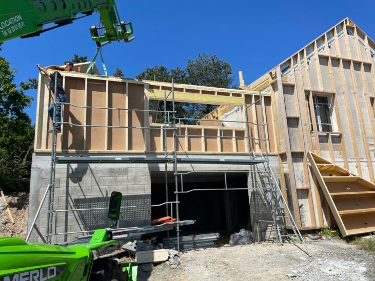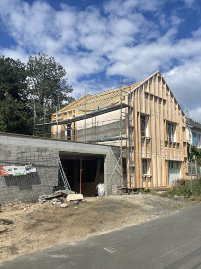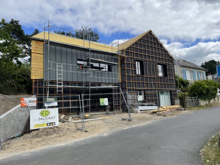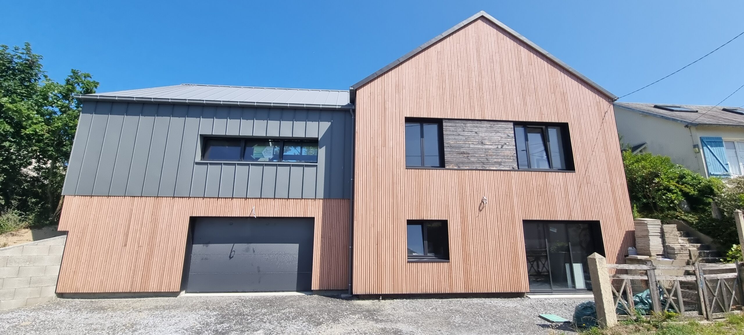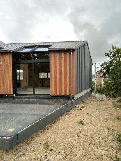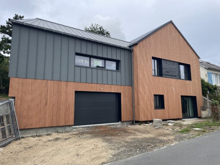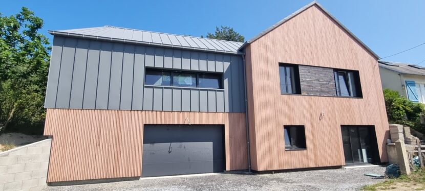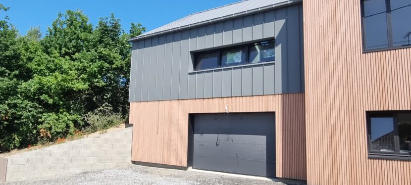 L’extension est un volume simple sur 2 niveaux composé d’une toiture 2 pans en zinc. Le garage en sous-sol est en agglo bancheur, recouvert d’un bardage claire voie ; le volume supérieur est en ossature bois, recouvert de zinc à joints debout.